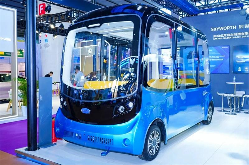 Vehiculul pentru vizitarea obiectivelor turistice fără pilot de nivel Blue Whale L4, dezvoltat independent de Kaiwo Group, a devenit punctul central al sălii de expoziție cu designul biomimetic, cabina inteligentă fără volan și capabilitățile de conducere autonome de nivel L4. Vehiculul integrează conducerea de la distanță 5G, percepție panoramică de 360 de grade și tehnologie de conducere autonomă la viteză redusă, care poate fi aplicată în mod flexibil în diverse scenarii, cum ar fi parcuri tehnologice, atracții turistice, hub-uri aeroportuare și stațiuni. Este o etapă importantă pentru Skyworth Automotive să prezinte viitorul transport inteligent.